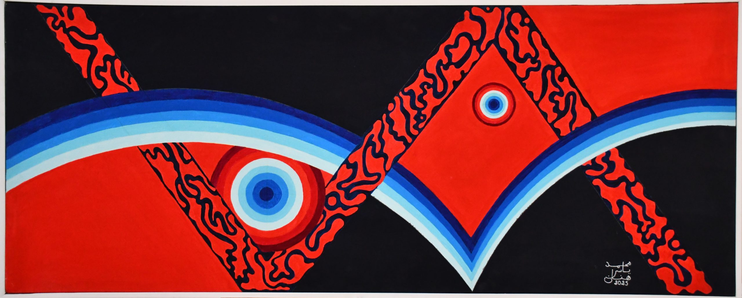 Yassir Mohammed HennaneDes Traits sinueux formant des formes adjacentes avec des interstices viennent harmonieusement se combiner aux couleurs dégradées ou contrastées pour donner vies à des compositions plaisantes à l’œil et à l’esprit.